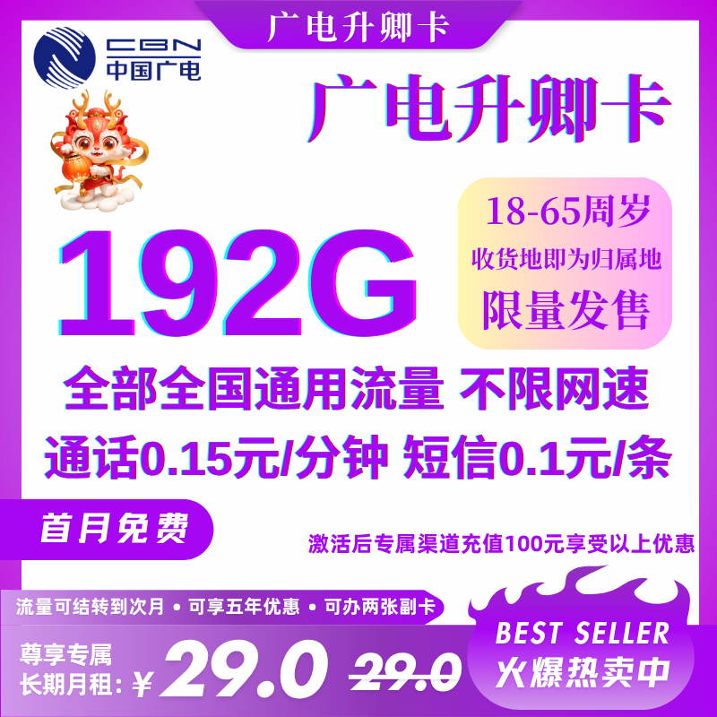 29元192G全国通用流量+0.15元/分钟(首月免费,收货地即为归属地)