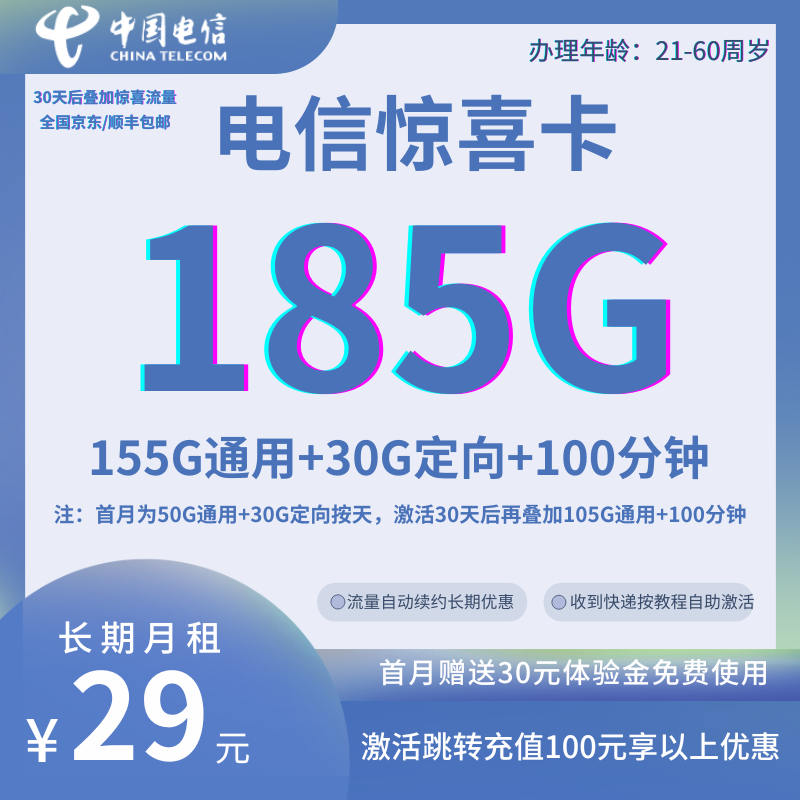 29元185G全国流量+0.1元/分钟(自助激活,首月免费80G按天折算)