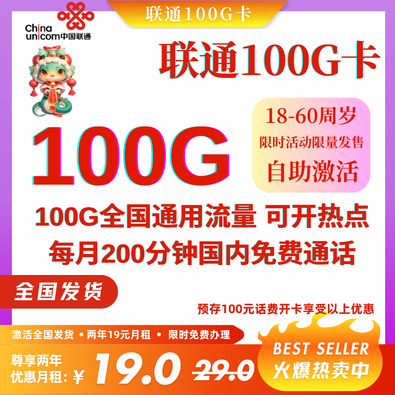 19元100G全国通用流量+200分钟国内通话(两年优惠)
